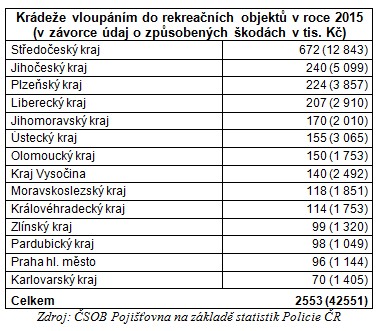 Největší riziko vloupání do rekreačních objektů hrozí tradičně ve Středočeském kraji, nejnižší v Karlovarském. Z 2553 krádeží vloupáním do chat, které se staly během loňského roku, jich na Středočeský kraj připadá 672. Nejméně se vykrádaly chaty v Karlovarském kraji. Nemalé jsou i škody, které takto zloději způsobí. Loni se vyšplhaly přes 40 milionů korun.